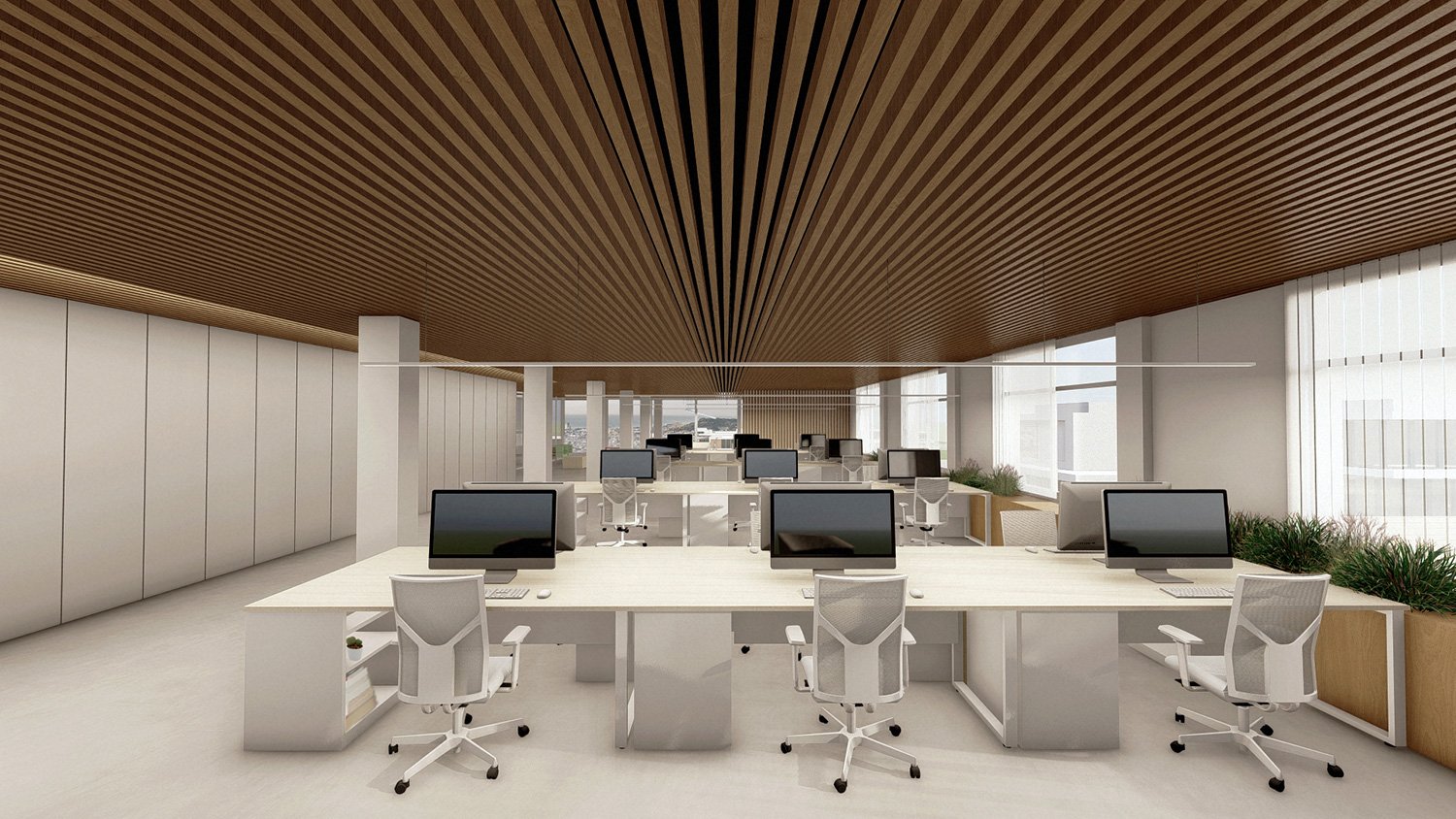 Se trabaja en un distribución diáfana con diferentes espacios y usos, zonas de trabajo, áreas de interacción social, networking y zonas independientes que ofrecen más privacidad para reuniones de trabajo y para clientes. El local, cuenta con fachadas en todas las orientaciones, lo que nos permite partir de una base muy ventajosa en cuanto a asoleamiento se refiere. La flexibilidad de los espacios es un elemento fundamental para la distribución de las diferentes áreas en oficinas contemporáneas. Así pues, todos los espacios se proyectan con una gran elasticidad y predisposición de cambio y adecuación según las necesidades de cada momento. Para ello, se utiliza compartimentaciones móviles y superficies de transición entre diferentes estancias.